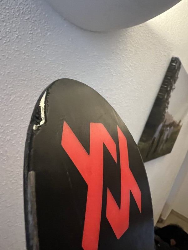 Bei einem Ski ist an der Spitze der Belag abgebrochen.